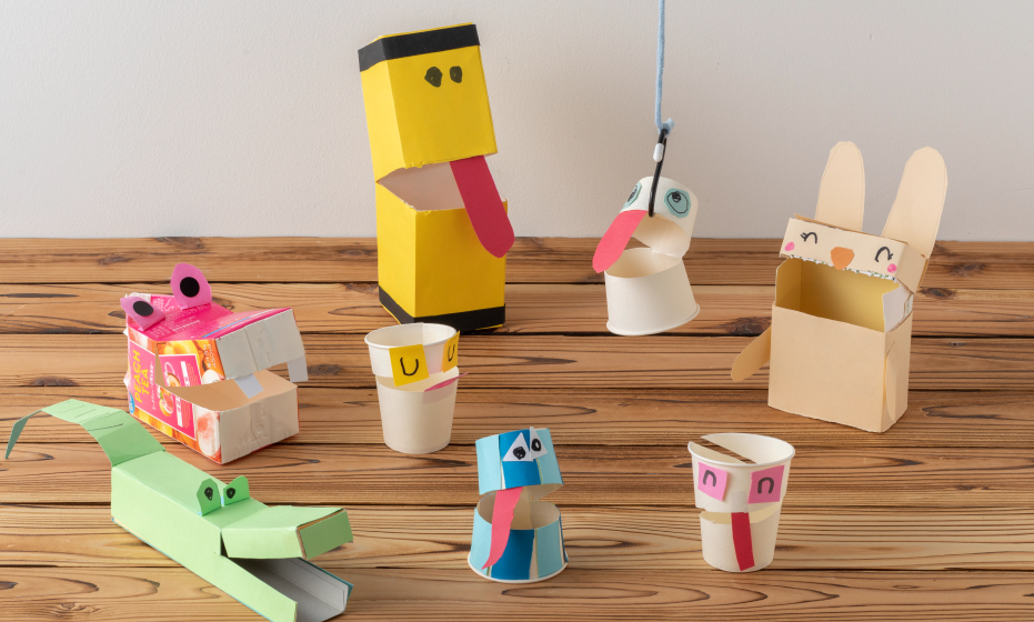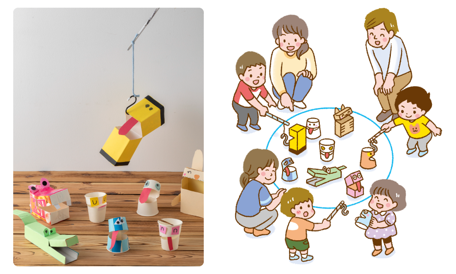 紙パックや紙カップ、空き箱などの身近にある素材を使っていろいろな人形を作り、釣りを楽しみましょう。