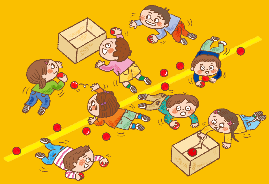 両方の陣地の真ん中辺りにボールを転がしておく。 - ②「スタート」の合図で腹ばいのまま移動し、ボールをつかんで相手陣地の箱に入れにいく。