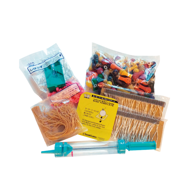 釣り針と釣りひもは完成品。糸ゴムにはループ加工を施しています。