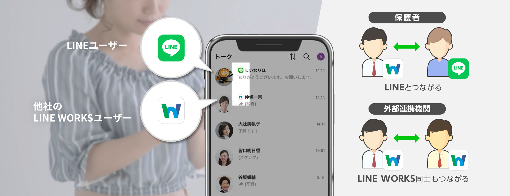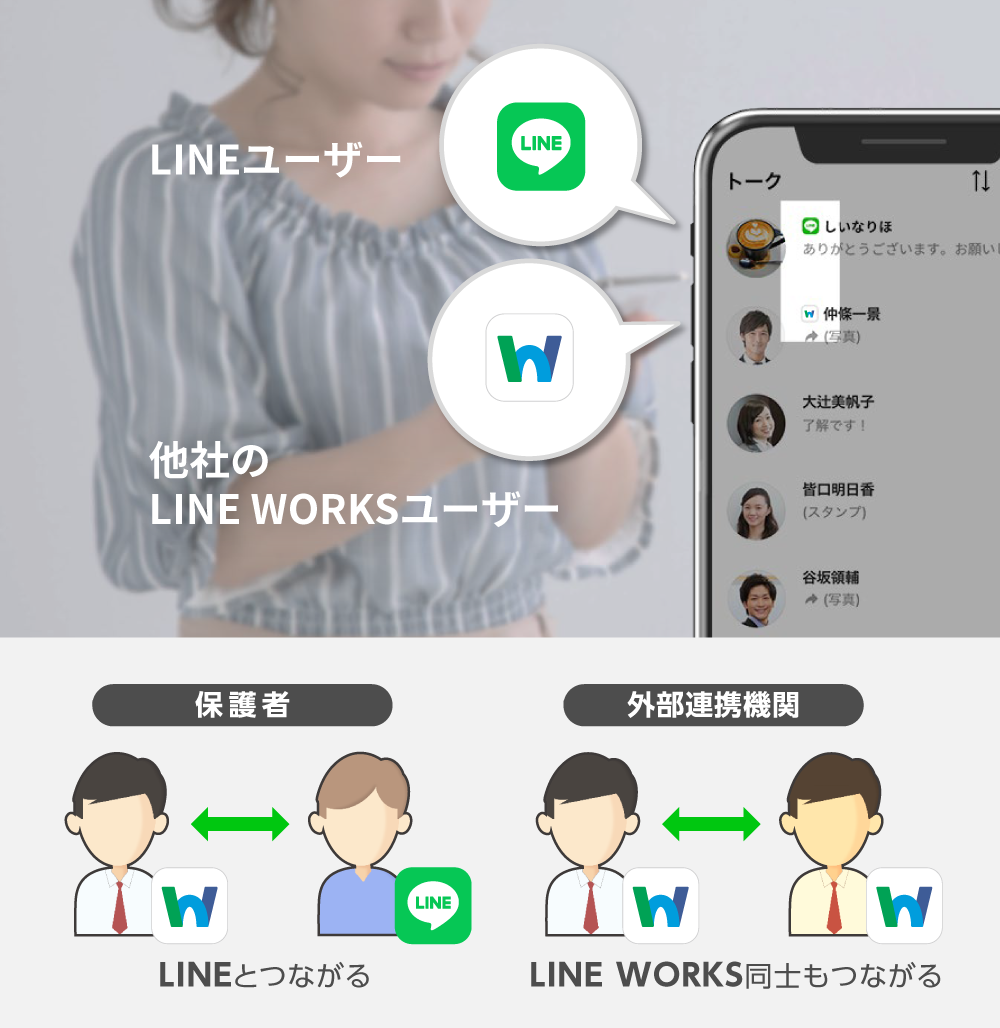 LINE WORKSが選ばれる理由 LINEに似た操作性で直感的に使えるので教育コストが不要! LINEとも繋がれるので保護者や外部機関との連携もスムーズ! 金融機関も認めるセキュリティ性で個人情報を厳重に管理!