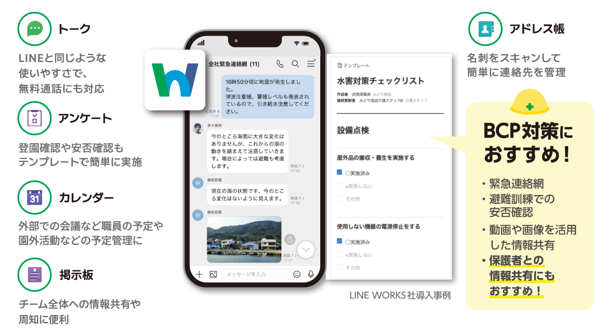 こんなお悩みはありませんか? 日々の業務連絡に個人LINEを使うことに抵抗がある BCP対策としての緊急連絡ツールを整備したい 保護者や外部連携機関との連絡に手間や時間がかかっている セキュリティ機能を備えた環境下で情報を管理したい その悩み、すべてLINE WORKSで解決できます! 職員や外部連携機関、保護者とのコミュニケーションがスムーズになり業務効率化・教育の質向上につながる!