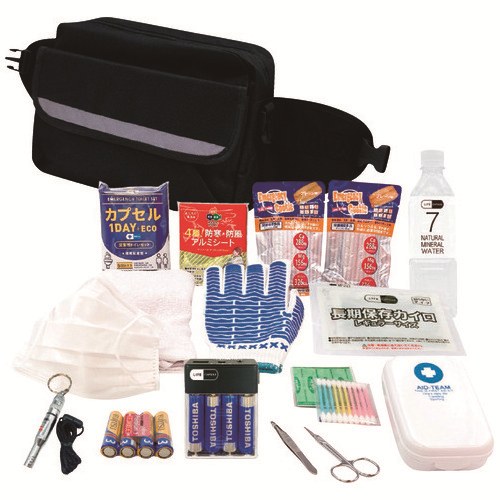 ●外形寸法(幅)[mm]:300●外形寸法(奥)[mm]:150●外形寸法(高)[mm]:200●質量[kg]:1.3●セット内容:2WAY ポーチ× 1 個、保存水500mL × 1 本、エマージェンシークッキー(プレーン)× 2 食、マルチ充電 LED ライト× 1個、単 3 形乾電池× 4 本、アルミブランケット× 1 枚、簡易トイレ 5 回分× 1セット、緊急呼子笛× 1 個、タオル× 1 枚、常備用カイロ× 1 個、簡易救急セット× 1 個、スベリ止め付軍手× 1 双、マスク× 1 枚●保存期限:5年(製造時より)●セット内容は、予告なく同等品に差し替えとなる場合がございます。あらかじめご了承ください。 ●最小出荷単位: 1