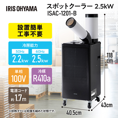 ●外寸(幅×奥×高):405×430×855mm(高さは排熱ダクト除く)※蛇腹を縮めた状態の排熱ダクトを含む高さ:1180mm●質量:約42kg●冷房能力:2.2kW/2.5kW(50/60Hz)●冷媒:R410a●冷媒封入量:460g●運転モード:弱・強●タンク容量:5.0L(満水停止機能あり)●定格消費電力:900W/1100W(50/60Hz)●電源:AC100V(50/60Hz)●電源コード長:約1.7m●付属品:冷風ダクト、ダクト用エルボ、排熱ダクト、ドレンホース(約1m)●保証期間:1年間 ●最小出荷単位: 1