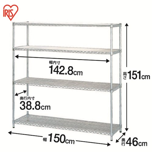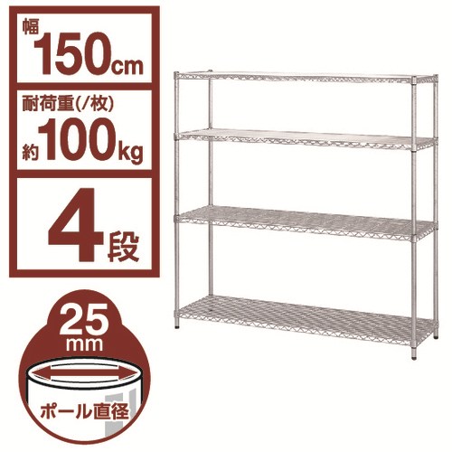 ●外形寸法(幅)[mm]:1500●外形寸法(奥)[mm]:460●外形寸法(高)[mm]:1510●質量[kg]:29.3●棚可動ピッチ[mm]:25●最大積載質量(1段あたり):100kg●セット内容:支柱4本、棚板4枚(固定部品付)●組立所要時間目安:2人20分●組立必要工具:プラスチックハンマー●アジャスター:有●材質:棚板・支柱=スチール(クロームメッキ仕上)、棚板固定部品=ABS樹脂 ●最小出荷単位: 1