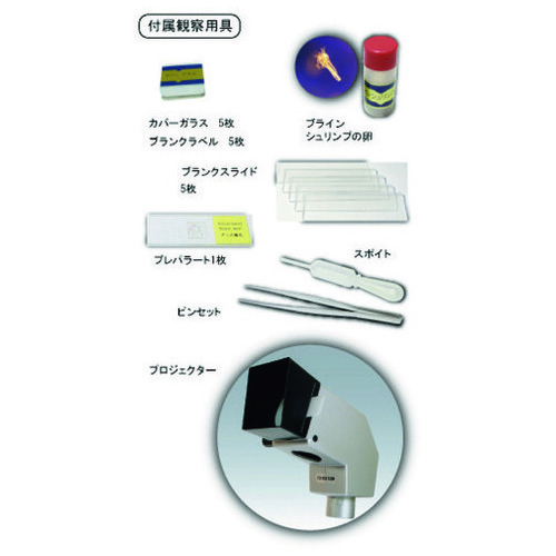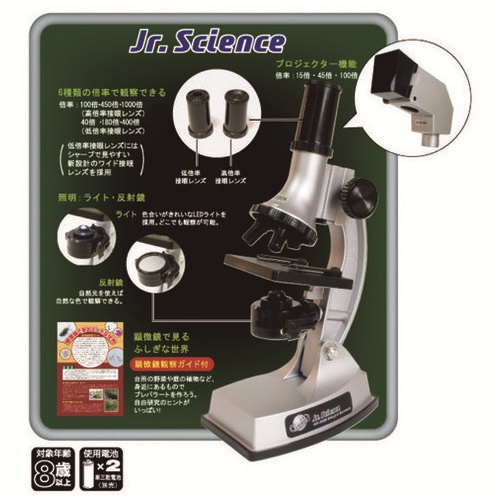●寸法:27.5×15×7.6cm●質量:220g●倍率:40倍から1000倍までの6種類●付属品:脱着式プロジェクター、接眼レンズ2種(低倍率用・高倍率用)、プレパラート1枚(グミの麟毛)、ブランクスライド5枚、ピンセット、スポイト、カバーガラス5枚、ブランクラベル5枚、ブラインシュリンプの卵、説明書、観察ガイド、保証書●注意事項:直射日光を直接顕微鏡にあててのぞかないでください。目を傷める危険があります。●照明=LED、反射鏡(単三乾電池2本使用 別売り)●原産国:日本 ●最小出荷単位: 1