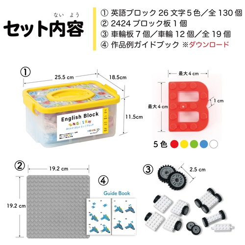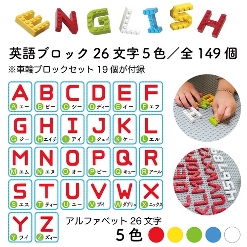 ●セット内容:文字ブロック=アルファベット大文字130個(26種x各5色)/ケース/ブロックホイールセット:19個/ブロック基本板=1枚●材質:文字ブロック=ABS/ケース=PP/ブロックホイールセット=ABS・ソフトプラスティック/ブロック基本板=PP●対象年齢:3歳以上 ●最小出荷単位: 1