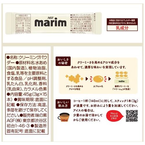 ●種別:マリーム●入数:15本●内容量(個装):3g●種類:クリーミングパウダー●容器形状:スティック(箱)●軽減税率:対象●製造国:日本●メーカーの都合によりパッケージや仕様などが変更になる場合がございますので、あらかじめご了承ください。 ●最小出荷単位: 1