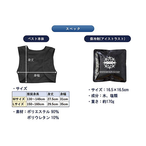 熱中症対策の新定番。凍らせた保冷剤「アイストラスト」をメッシュベストに入れて身に付けるだけ。保冷剤の容量を大人用の半分の150gに減らし、低学年のお子さまでも負担なく背負えるサイズにしました。保冷剤「アイストラスト」が凍るまでの時間は約6時間と短く便利です。メッシュベストはスポーツウェアメーカーだからできた抜群のフィット感。150~160cm対応のキッズ用Lサイズです。速乾素材なので汗をかいてもサラリ、洗濯してもすぐに乾くのでいつでも清潔に保つことができます。体温調節機能が未発達のお子さまの登下校や体育の授業、課外活動などにおすすめ。