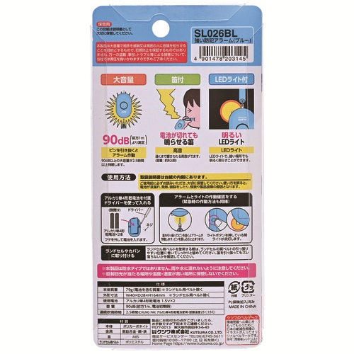 ●寸法:幅40×奥28×高188mm●質量:59g●音量[dB]:90●使用電池:単4形アルカリ電池×2本(付属なし)●電池寿命:連続約2.5時間●色:ブルー●付属品:ランドセル用ベルト、電池交換用ドライバー●材質:本体=PC、笛=ABS、金具=亜鉛合金・銅・鉄、ランドセル用ベルト=ポリエステル●ブザーの鳴らし方=ピンを引き抜く(ピンと本体は分離します)●(公財)全国防犯協会連合会推奨番号:25R298号 ●最小出荷単位: 1