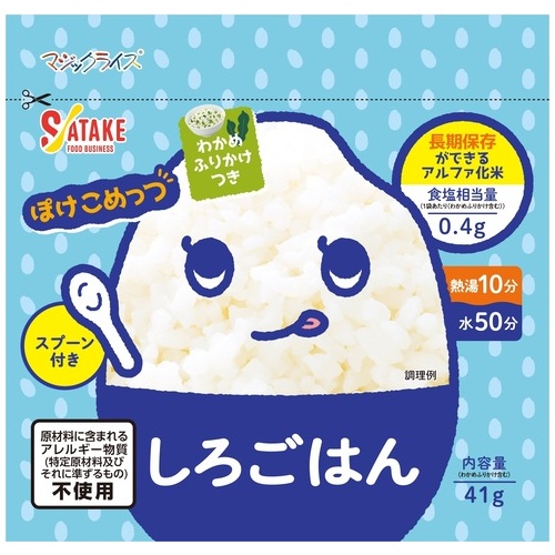 ●入数:50袋●内容量:41g●外装箱寸法(幅)[mm]:305●外装箱寸法(奥)[mm]:420●外装箱寸法(高)[mm]:145●外装箱質量[kg]:3.1●カロリー[kcal]:157●賞味期限:メーカー製造日より7年11ヶ月(製造より半年以内の商品をお届けします。)●注水量:74ml●調理方法:(1)開封後、脱酸素剤・スプーン・わかめふりかけを取り出し、袋の底を広げます。(2)熱湯または水(20℃)を、袋の内側の注水線まで(74ml)注ぎ、よく混ぜます。(3)チャックを閉め、熱湯の場合10分、水の場合50分お待ちください。(4)よく混ぜてから、わかめふりかけをお好みの量ふりかけ、お召し上がりください。(出来上がり量 115g)●調理時間:水で5分/熱湯で10分●アレルゲン情報:アレルゲン物質28品目不使用●※商品の改訂などにより、お手元の商品と記載内容が異なる場合がございます。必ずお手元の商品を確認してから、お召し上がりください。●軽減税率:対象●規格:41g×50袋入●種別:しろごはん●付属品:スプーン付●付属品2:脱酸素剤(非鉄系)1個●製造国:日本●注意事項:直射日光、高温多湿を避けて、常温で保存してください。 ●最小出荷単位: 1