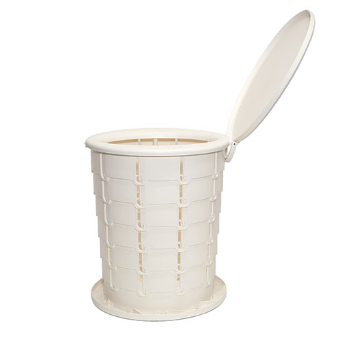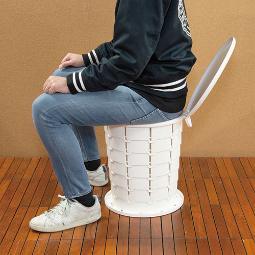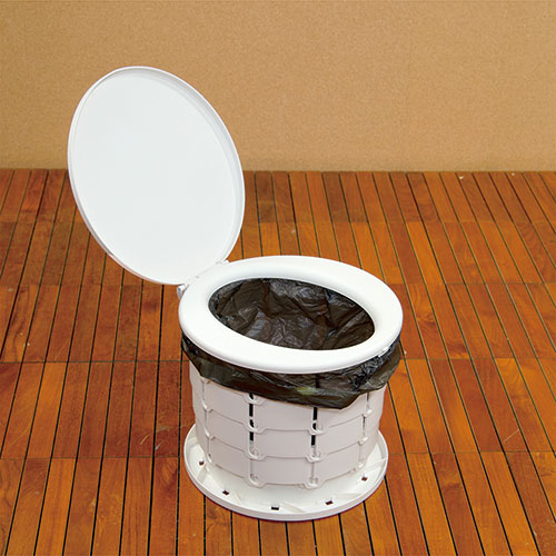 使わない時はコンパクトに収納できる、折り畳み簡易トイレ。プラスチック製なので本体丸洗い可能。