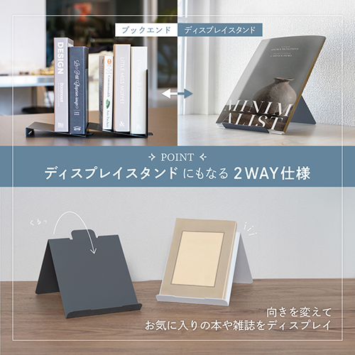 本が倒れにくい斜め設計の新発想ブックスタンド「ブックチルト」は、収納とディスプレイの2通りで使えるアイテムです。従来のブックエンドの欠点だった本の転倒を、斜めの台座構造で解消。お気に入りの本を飾るインテリアとしても活用でき、カラーはホワイト・ブラック・グレーの3色展開、部屋の雰囲気に合わせて選べます。