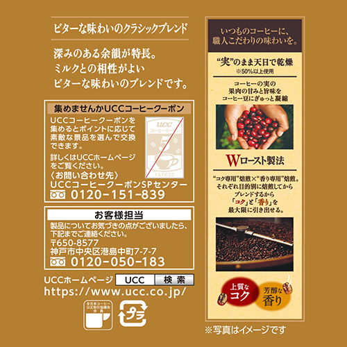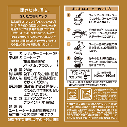 ●種別:ビターな味わいのクラシックブレンド●タイプ:粉タイプ●内容量:280g●何杯分:約28杯分●原産国:日本●ブランド:UCC職人の珈琲●規格:レギュラーコーヒー●軽減税率:対象●メーカーの都合によりパッケージや仕様などが変更になる場合がございますので、あらかじめご了承ください。 ●最小出荷単位: 1