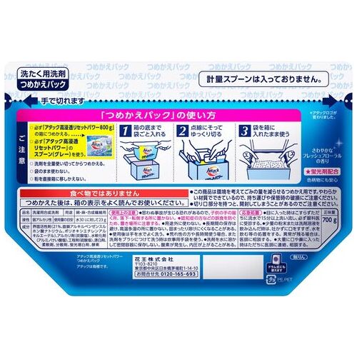 ●品目:洗たく用洗剤(洗濯用合成洗剤)●用途:綿・麻・合成繊維用●内容量:700g●タイプ:粉末●香り:さわやかなフレッシュフローラルの香り●種別:つめかえ用●液性:弱アルカリ性●成分:界面活性剤(21%、直鎖アルキルベンゼンスルホン酸ナトリウム、ポリオキシエチレンアルキルエーテル)、アルカリ剤(炭酸塩)、水軟化剤(アルミノけい酸塩)、工程剤(硫酸塩)、漂白剤、 柔軟剤、分散剤、蛍光増白剤、酵素 ●最小出荷単位: 1