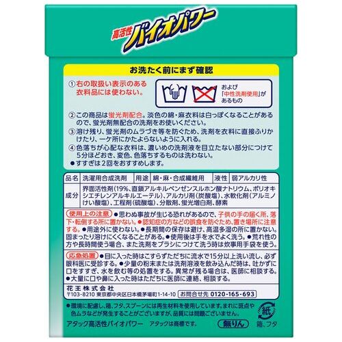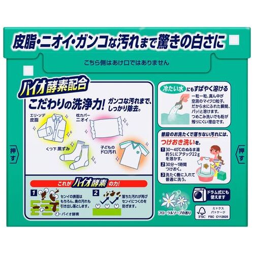 ●品目:衣料用洗剤●品名:洗濯用合成洗剤●タイプ:粉末●内容量:850g●香り:フローラルソープの香り●成分:界面活性剤(19%、直鎖アルキルベンゼンスルホン酸ナトリウム、ポリオキシエチレンアルキルエーテル)、アルカリ剤(炭酸塩)、水軟化剤(アルミノけい酸塩)、工程剤(硫酸塩)、分散剤、蛍光増白剤、酵素●付属品:計量スプーン入り ●最小出荷単位: 1
