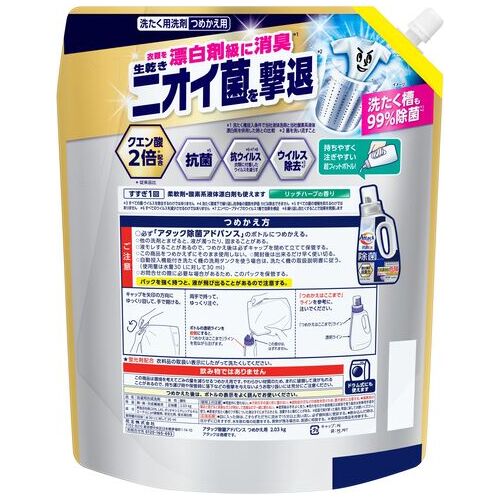 ●内容量:2030g●成分:界面活性剤(20%、LAS、ポリオキシエチレンアルキルエーテル)、pH調整剤、安定化剤、蛍光増白剤●液性:酸性●香り:リッチハーブの香り●用途:綿・麻・合成繊維用●品目:衣料用洗剤●品名:洗濯用合成洗剤●種別:つめかえ用●製造国:日本 ●最小出荷単位: 1