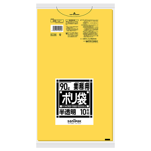 幅広いラインナップの業務用ポリ袋、ツルツルした手触り(LD材)の黄半透明90L厚み0.045mmタイプ。