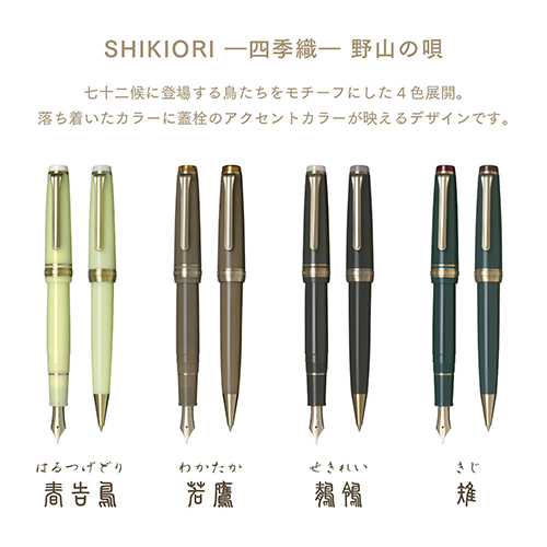 日本の自然が織りなす四季を感じる筆記具シリーズ「四季織」。本製品のカラーテーマは「野山の唄」。野山に響く鳥たちのさえずりに耳を傾けるシリーズ。