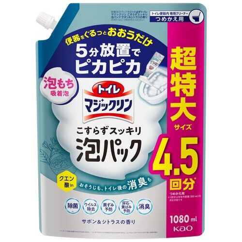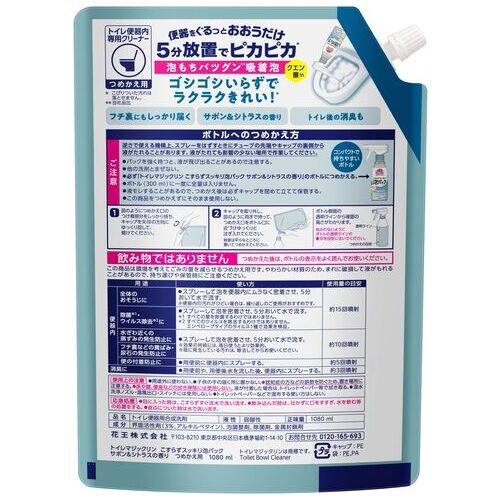 ●内容量[mL]:1080●内容量:1080mL●液性:弱酸性●香り:サボン&シトラス●使用用途:トイレ便器内 専用クリーナー●種別:つめかえ●材質:界面活性剤(3%、アルキルベタイン)、泡調整剤、除菌剤、金属封鎖剤●製造国:日本●注意事項:空中にスプレーしない。●液の残量が少ないとき、直立・直倒立以外の角度では出にくくなることがある。●用途外に使わない。●床や壁、便座などの拭き掃除には使用しない。液が付着した場合は、トイレットペーパー等で拭き取る。●温水洗浄ノズル・温風出口・スイッチには使用しない。●トイレットペーパーなどで湿布する使い方はしない。●子供の手の届く所に置かない。●認知症の方などの誤飲を防ぐため、置き場所に注意する。●荒れ性の方や長時間使用する場合は炊事用手袋を使う。 ●最小出荷単位: 1