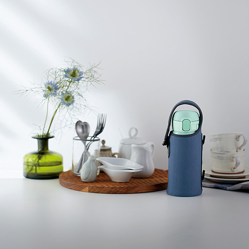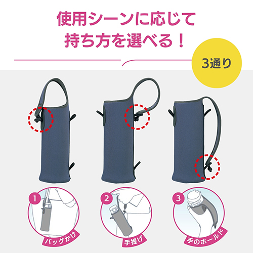シーンに応じて選べる持ち方3WAY。伸縮性、弾力性に優れたストレッチ素材(生地)を採用。カバーをつけたままでも飲みやすい本体形状です。