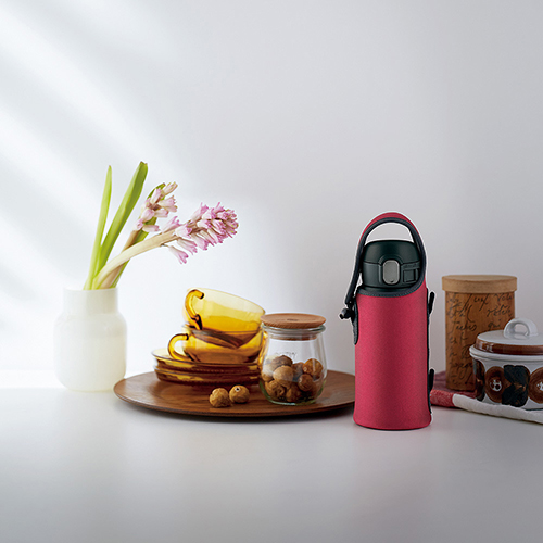 シーンに応じて選べる持ち方3WAY。伸縮性、弾力性に優れたストレッチ素材(生地)を採用。カバーをつけたままでも飲みやすい本体形状です。