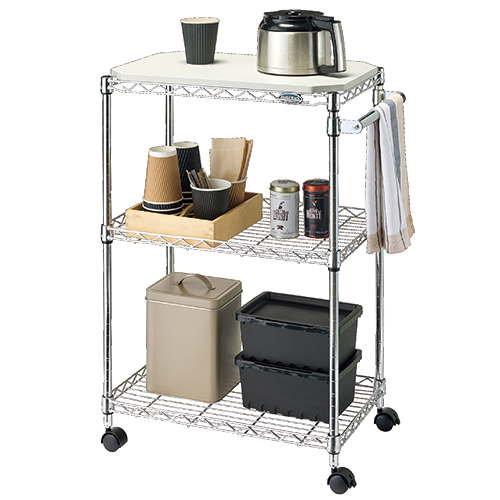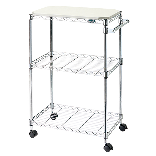 メラミン棚板を使用したクロームメッキ仕上げのワゴン/「組立有料サービス付」。天板はメラミン樹脂のため、耐熱・耐水性に優れキズがつきにくくなっています。移動やタオル掛けに便利なハンガーバーは、天板よりも低い位置に取り付けられるので、作業時にも邪魔になりません。物が落ちにくいトレー型棚板2枚付きです。移動に便利なキャスター付きです。★「組立有料サービス」が不要な場合は、商品コード239-849をお選びください。