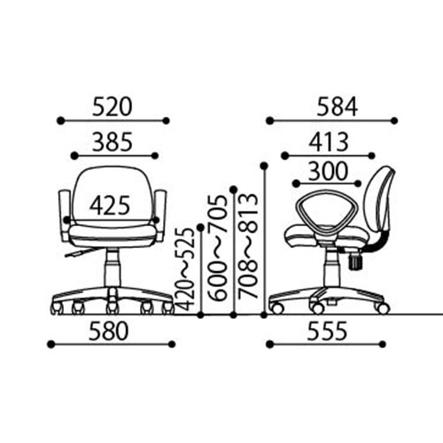 ●外形寸法(幅)[mm]:580●外形寸法(奥)[mm]:584●外形寸法(高)[mm]:708~813●質量[kg]:10.4●タイプ:PVCレザー張●肘:肘付き●肘タイプ:固定式●色:ブルー●座面高[mm]:420~525●座面寸法(幅)[mm]:425●座面寸法(奥)[mm]:413●肘高[mm]:600~705mm●材質:背(張地/芯材)=PVCレザー/ポリプロピレン、座(張地/芯材)=PVCレザー/成型合板、クッション=ウレタンフォーム、脚=強化樹脂、キャスター=ナイロン双輪キャスター、肘=ポリプロピレン●機能:ガス圧座上下、背ロッキング ●最小出荷単位: 1