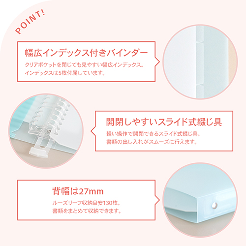 ロングセラーのパペルールを「きれいな色の組み合わせ×シンプルで飽きのこないデザイン」というコンセプトはそのままにリニューアルしました。ロゴマークを刷新し、表2ポケットをデザインのアクセントに。幅広の表紙とインデックスで、クリアポケット使用時にもインデックスが隠れず、プリントの整理にも便利です。