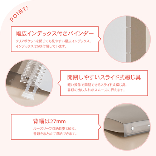 ロングセラーのパペルールを「きれいな色の組み合わせ×シンプルで飽きのこないデザイン」というコンセプトはそのままにリニューアルしました。ロゴマークを刷新し、表2ポケットをデザインのアクセントに。幅広の表紙とインデックスで、クリアポケット使用時にもインデックスが隠れず、プリントの整理にも便利です。