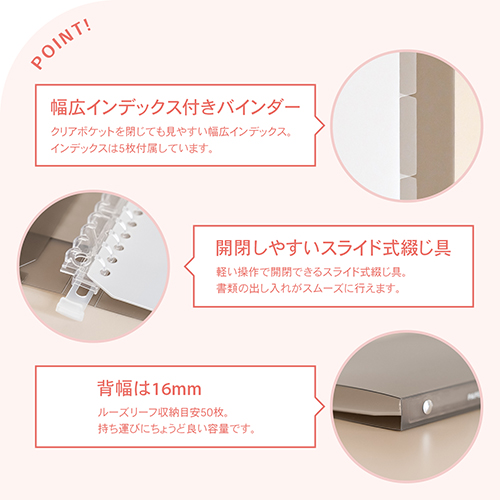 ●表紙:PP素材(表2ポケット付き) ●綴じ具:開閉しやすいスライド式綴じ具 ●インデックス:PP素材、5枚付き ●規格:B5スリム ●サイズ:W227×H270×D16mm ●カラー:グレー ●リーフ収納目安:50枚 ●最小出荷単位: 2
