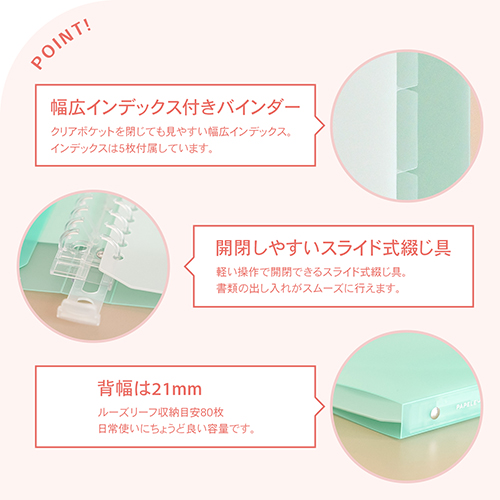 ●表紙:PP素材(表2ポケット付き) ●綴じ具:開閉しやすいスライド式綴じ具 ●インデックス:PP素材、5枚付き ●規格:A5ミドル ●サイズ:W198×H225×D21mm ●カラー:ミントグリーン ●リーフ収納目安:80枚 ●最小出荷単位: 2