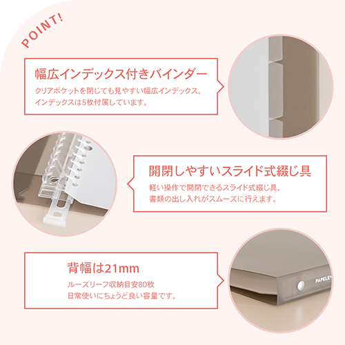 ロングセラーのパペルールを「きれいな色の組み合わせ×シンプルで飽きのこないデザイン」というコンセプトはそのままにリニューアルしました。ロゴマークを刷新し、表2ポケットをデザインのアクセントに。幅広の表紙とインデックスで、クリアポケット使用時にもインデックスが隠れず、プリントの整理にも便利です。