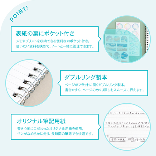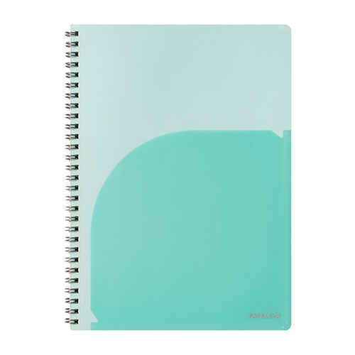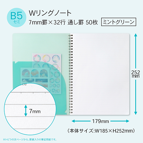 ●表紙:丈夫なPP素材(表2ポケット付き) ●本文用紙:オリジナル筆記用紙 A上質 70g/㎡ ●製本:Wリング綴じ製本 ●規格:セミB5 ●本文サイズ:179×252mm ●罫内容:7mm罫 32行 通し罫 ●枚数:50枚 ●カラー:ミントグリーン ●最小出荷単位: 5