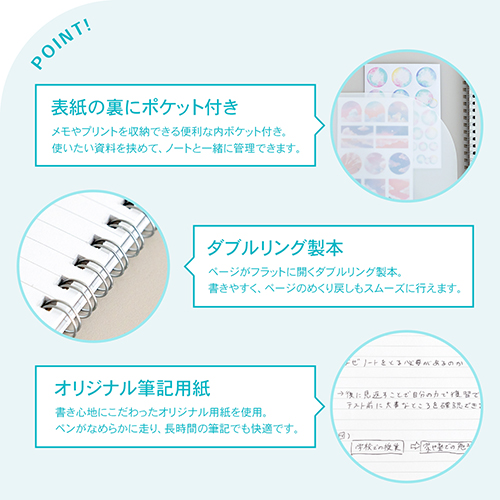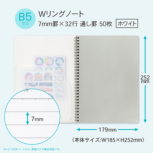 ●表紙:丈夫なPP素材(表2ポケット付き) ●本文用紙:オリジナル筆記用紙 A上質 70g/㎡ ●製本:Wリング綴じ製本 ●規格:セミB5 ●本文サイズ:179×252mm ●罫内容:7mm罫 32行 通し罫 ●枚数:50枚 ●カラー:ホワイト ●最小出荷単位: 5