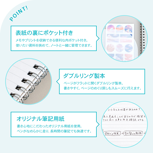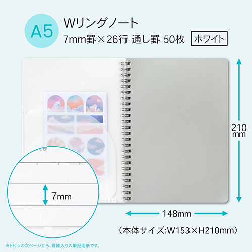 ●表紙:丈夫なPP素材(表2ポケット付き) ●本文用紙:オリジナル筆記用紙 A上質 70g/㎡ ●製本:Wリング綴じ製本 ●規格:A5 ●本文サイズ:148×210mm ●罫内容:7mm罫 26行 通し罫 ●枚数:50枚 ●カラー:ホワイト ●最小出荷単位: 5