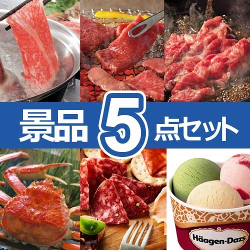 景品付き目録の5点セットです。選べる日本三大和牛、浜ゆでずわいがに1尾、スペイン産生ハム食べくらべ、ハーゲンダッツラバーズコレクション、全国ご当地らーめん味くらべ7食の各1種類、計5個のセットになります。