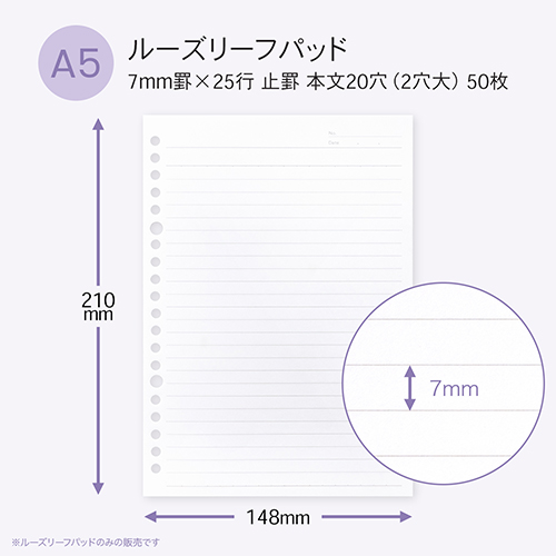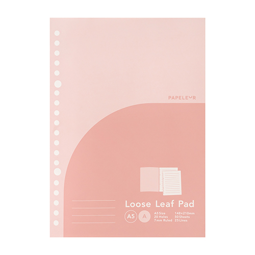 ●ルーズリーフパッド ●規格:A5 ●サイズ:148×210mm ●罫内容:7mm罫×25行 止罫 ●枚数:50枚 ●カラー:ピンク ●製本:長辺糊綴くるみ製本 ●表紙:コート紙 ●本文用紙:オリジナル筆記用紙 A上質 70g/㎡ ●最小出荷単位: 5