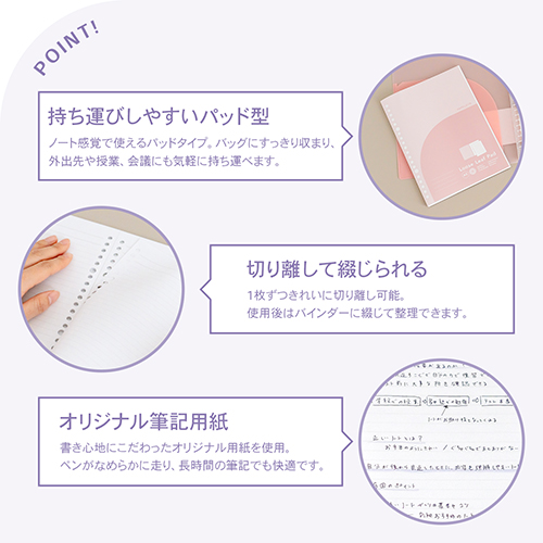 ロングセラーのパペルールを「きれいな色の組み合わせ×シンプルで飽きのこないデザイン」というコンセプトはそのままにリニューアルしました。バインダーとセット使いしやすいデザイン・仕様で、ルーズリーフパッド、バインダー穴つき ワイヤー綴じノート、バインダー用ポケットの3アイテムが新登場。