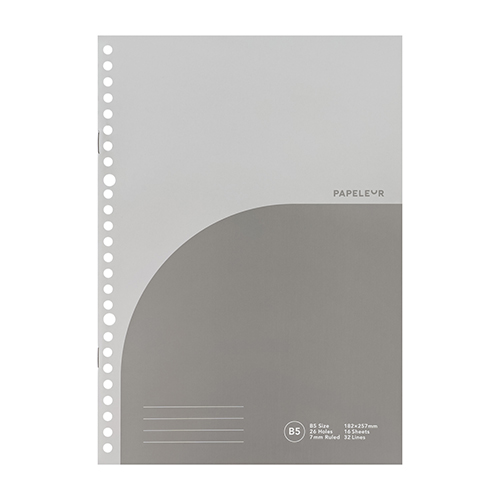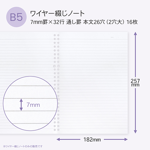 ●バインダー穴つきワイヤー綴じノート ●規格:B5 ●サイズ:182×257mm ●罫内容:7mm罫×32行 通し罫 ●枚数:16枚 ●製本:ワイヤー綴じ ●表紙:白板紙 ●本文用紙:オリジナル筆記用紙 A上質 70g/㎡ ●最小出荷単位: 5