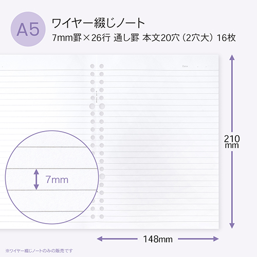 ●バインダー穴つきワイヤー綴じノート ●規格:A5 ●サイズ:148×210mm ●罫内容:7mm罫×26行 通し罫 ●枚数:16枚 ●製本:ワイヤー綴じ ●表紙:白板紙 ●本文用紙:オリジナル筆記用紙 A上質 70g/㎡ ●最小出荷単位: 5