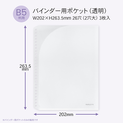 ●バインダー用ポケット ●規格:B5 ●本体サイズ:202×263.5mm ●入数:3枚入り ●カラー:クリア ●材質:PP素材 ●最小出荷単位: 5