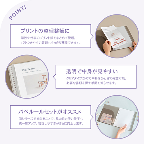 ロングセラーのパペルールを「きれいな色の組み合わせ×シンプルで飽きのこないデザイン」というコンセプトはそのままにリニューアルしました。バインダーとセット使いしやすいデザイン・仕様で、ルーズリーフパッド、バインダー穴つき ワイヤー綴じノート、バインダー用ポケットの3アイテムが新登場。