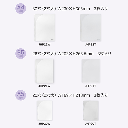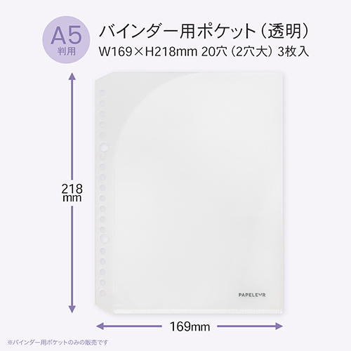 ●バインダー用ポケット ●規格:A5 ●本体サイズ:169×218mm ●入数:3枚入り ●カラー:クリア ●材質:PP素材 ●最小出荷単位: 5