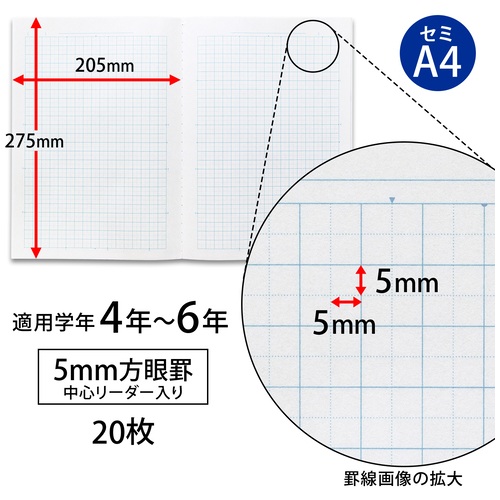 ●外形寸法(縦)[mm]:275●外形寸法(横)[mm]:205●枚数[枚]:20●方眼サイズ:5mm●マス数[マス]:17×24●罫内容:5mm方眼(リーダー入)●白色度:72%●製本形式:糸綴じ●色:イエロー●対象学年:4~6年・中学●規格:A4/ベルマーク参加商品●製造国:日本 ●最小出荷単位: 1