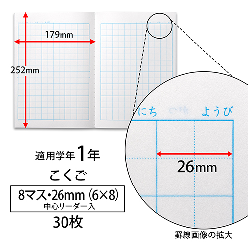 ●外形寸法(縦)[mm]:252●外形寸法(横)[mm]:179●枚数[枚]:30●マス数[マス]:6×8●白色度:82%●製本形式:糸綴じ●対象学年:1年●規格:セミB5●種別:こくご8マス●ベルマーク参加商品 ●最小出荷単位: 1