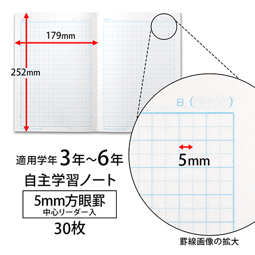 ●外形寸法(縦)[mm]:252●外形寸法(横)[mm]:179●枚数[枚]:30●白色度:82%●製本形式:糸綴じ●対象学年:3~6年●罫内容:5mm方眼(実線入)●規格:セミB5●種別:15×22マス●ベルマーク参加商品 ●最小出荷単位: 1