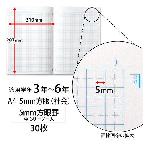●外形寸法(縦)[mm]:297●外形寸法(横)[mm]:210●枚数[枚]:30●マス数[マス]:18×26マス●白色度:82%●製本形式:糸綴じ●対象学年:3~6年●罫内容:5mm方眼罫●種別:社会 ●最小出荷単位: 1