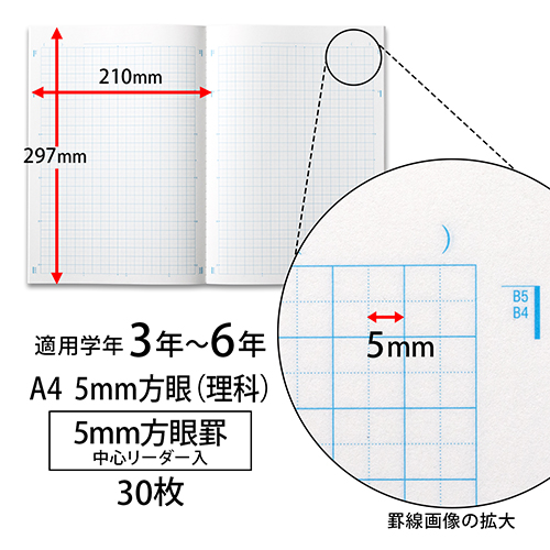 ●外形寸法(縦)[mm]:297●外形寸法(横)[mm]:210●枚数[枚]:30●マス数[マス]:18×26マス●白色度:82%●製本形式:糸綴じ●対象学年:3~6年●罫内容:5mm方眼罫●種別:理科 ●最小出荷単位: 1