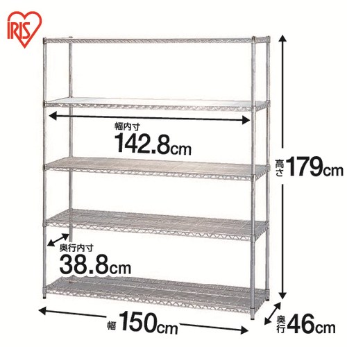 ●外形寸法(幅)[mm]:1500●外形寸法(奥)[mm]:460●外形寸法(高)[mm]:1785●質量[kg]:36.5●棚可動ピッチ[mm]:25●最大積載質量(1段あたり):100kg●セット内容:支柱4本、棚板5枚(固定部品付)●組立所要時間目安:2人20分●組立必要工具:プラスチックハンマー●アジャスター:有●材質:棚板・支柱=スチール(クロームメッキ仕上)、棚板固定部品=ABS樹脂 ●最小出荷単位: 1