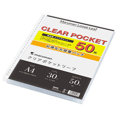 ルーズリーフと一緒にカスタマイズして使うと便利なアクセサリー。お得な50枚入りのクリアポケットリーフです。